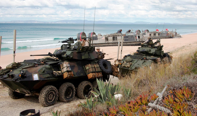 В видеорепортаже издания Observador можно наблюдать, как два судна на воздушной подушке типа LCAC с надписями US Navy на бортах под прикрытием вертолетов и под прицелом телекамер выходят на берег. Морские пехотинцы бодро организуют охрану периметра, трапы откидываются, а находившиеся на борту "Хаммеры" тут же садятся по брюхо в песок.